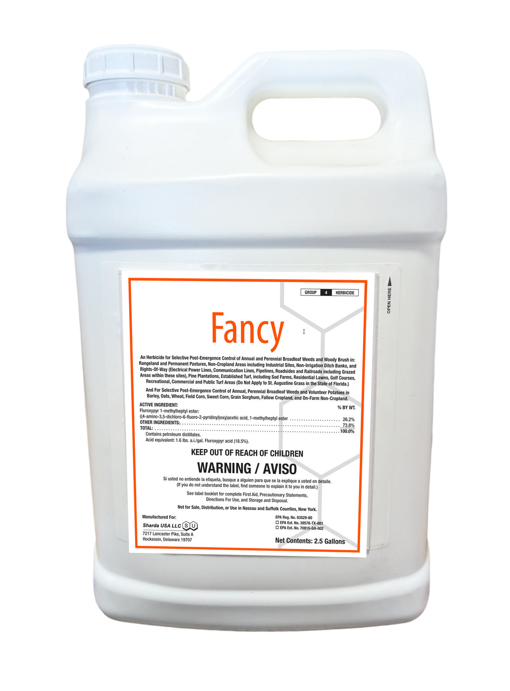 Fancy Herbicide provides selective post-emergence control of annual and perennial broadleaf weeds and woody brush in rangeland, permanent pastures, industrial sites, rights-of-way, and other non-crop areas. It’s also labeled for use in pine plantations, small grains, corn, grain sorghum, and on-farm non-cropland such as fence rows and building perimeters.