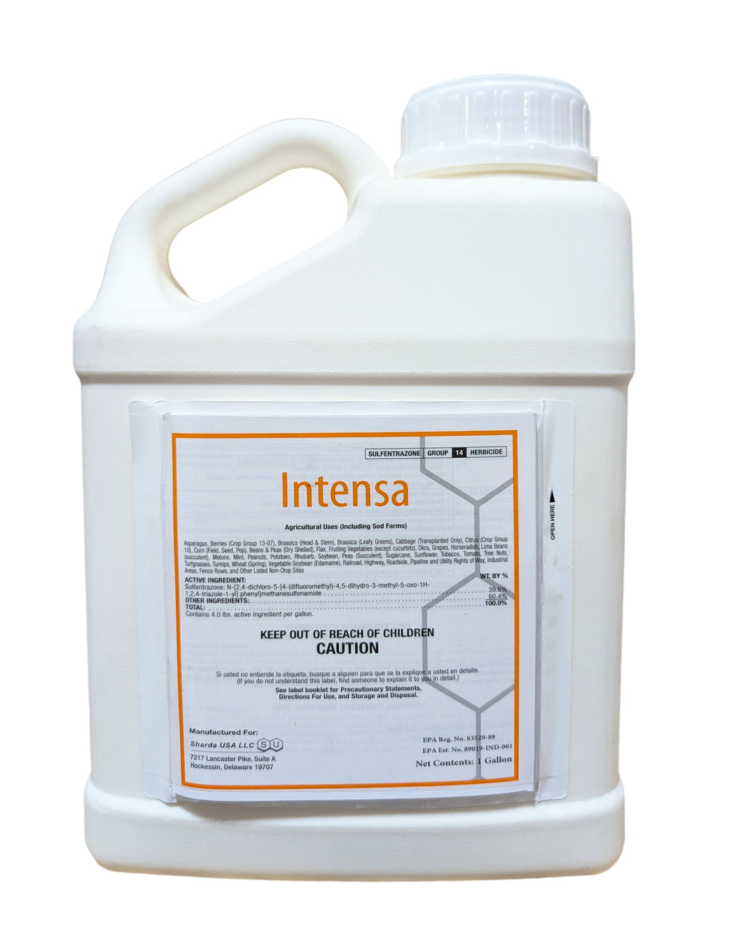 Intensa Herbicide is a soil-applied selective herbicide formulated to deliver fast, visible control of sedges, broadleaf weeds, and certain grasses in a wide range of labeled crops and non-crop areas. Powered by sulfentrazone, Intensa works by disrupting chlorophyll production at the cellular level, leading to rapid desiccation and long-lasting residual control.