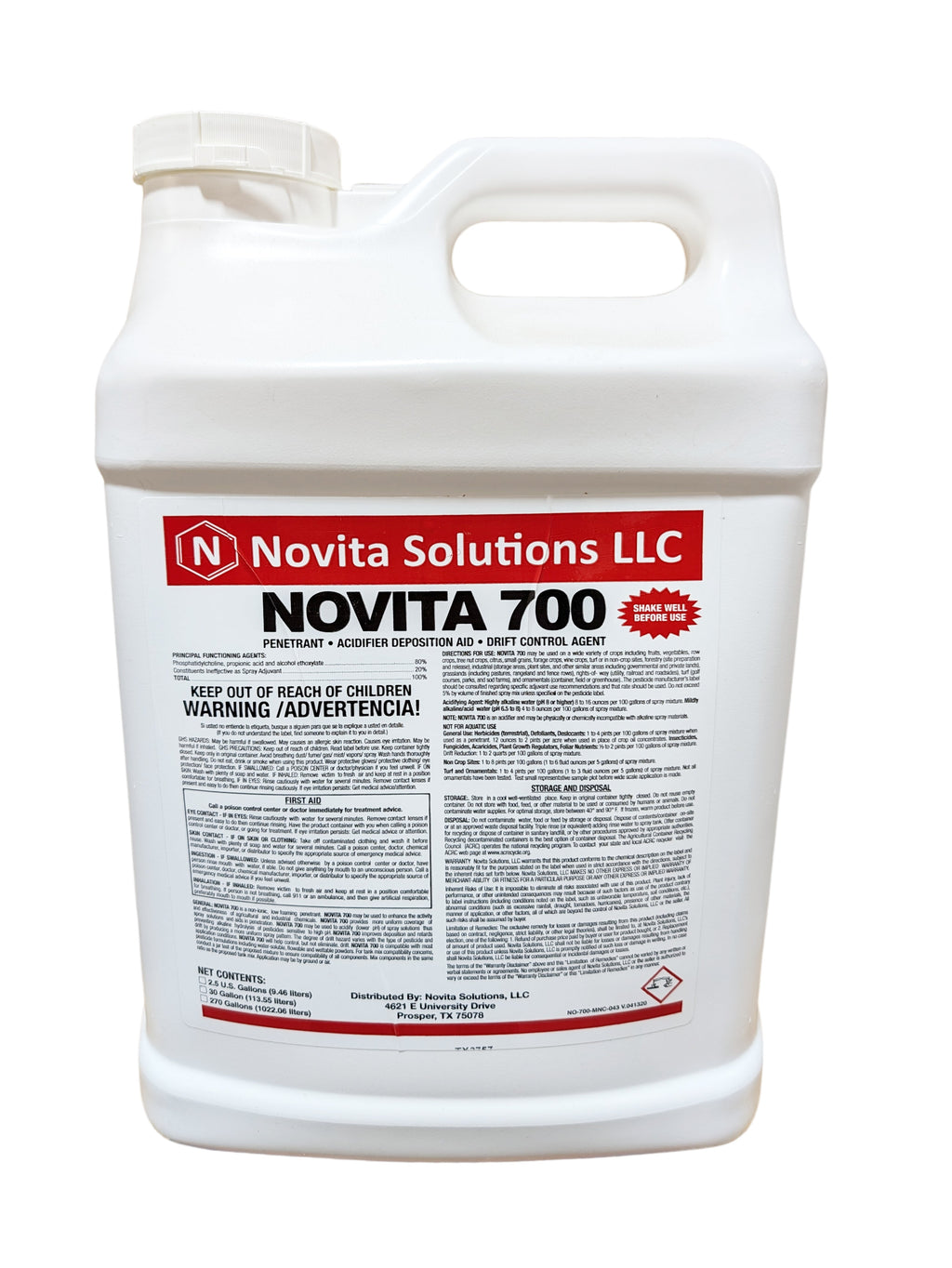 Novita 700 is a premium blend of soy lecithin, non-ionic surfactants, acidifiers, and drift control agents that enhances pesticide performance by improving penetration, deposition, drift reduction, and pH management. Designed for use with herbicides, fungicides, insecticides, and foliar nutrients, Novita 700 ensures optimum spray coverage and stability—even in challenging water conditions. Its acidifying properties help maintain the desired spray solution pH for maximum effectiveness of tank-mixed pesticides.