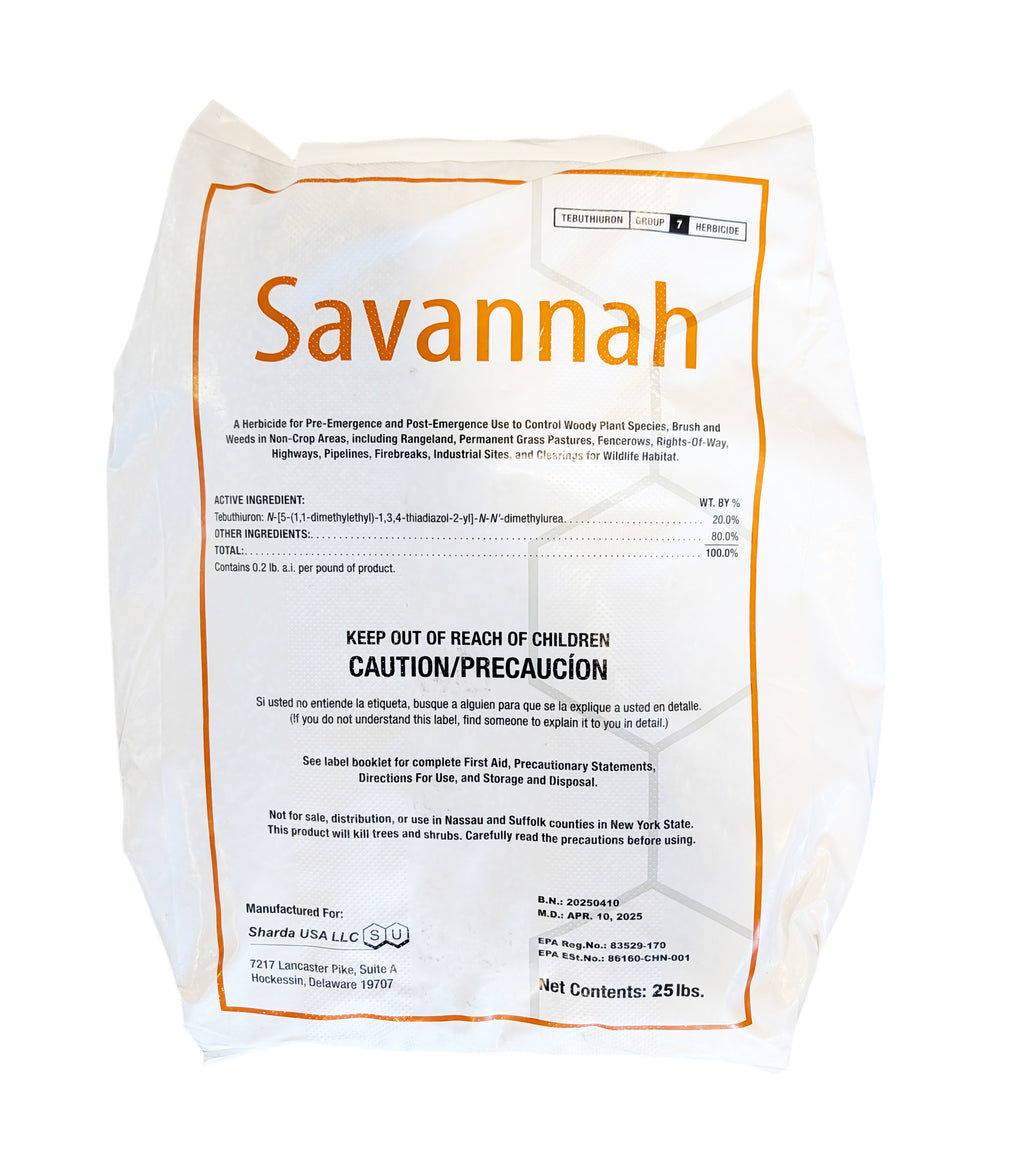 Savannah Herbicide is a premium, soil-active solution for controlling woody plants, brush, and invasive weeds in non-crop areas such as rangeland, rights-of-way, and wildlife habitats. It targets tough species like sage, oaks, tarbush, and creosote bush, delivering lasting control even after rainfall moves the active ingredient into the root zone. Suitable for pre- and post-emergence use, Savannah prevents regrowth for years, improving pasture quality and wildlife habitat.